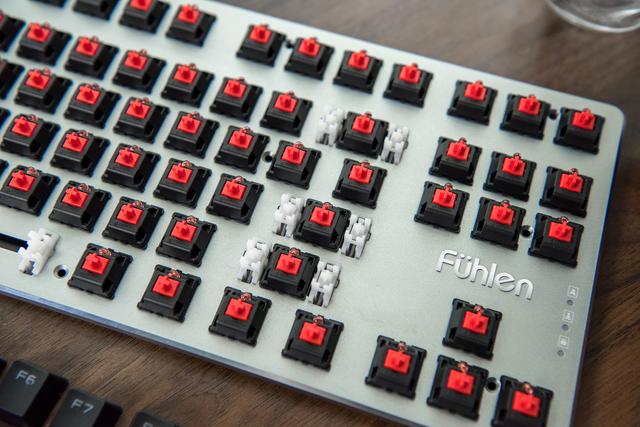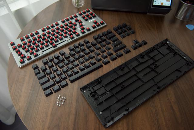 将87个键帽逐一拔掉,最初就成了这个样子,原厂Cherry轴可不是盖的呢,大要是年纪大了,对机械键盘起头逐步退烧,越来越喜好压力克数较低的红轴。